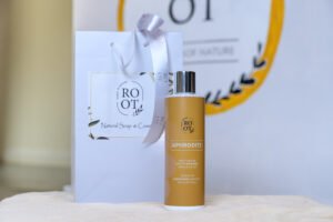With natural rose water which is manufactured in Greece by the Root Laboratory. Its notes give a high feeling of freshness.